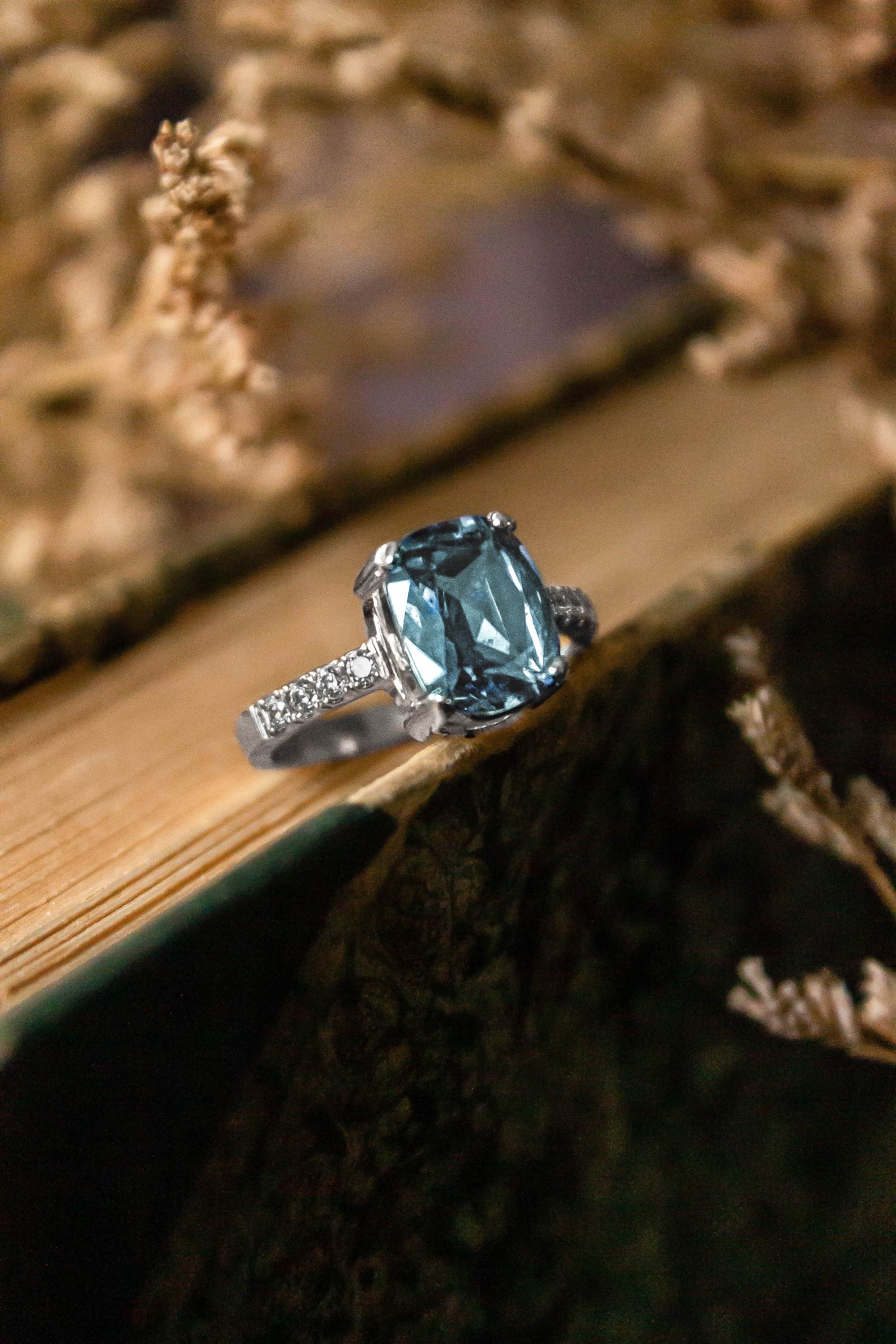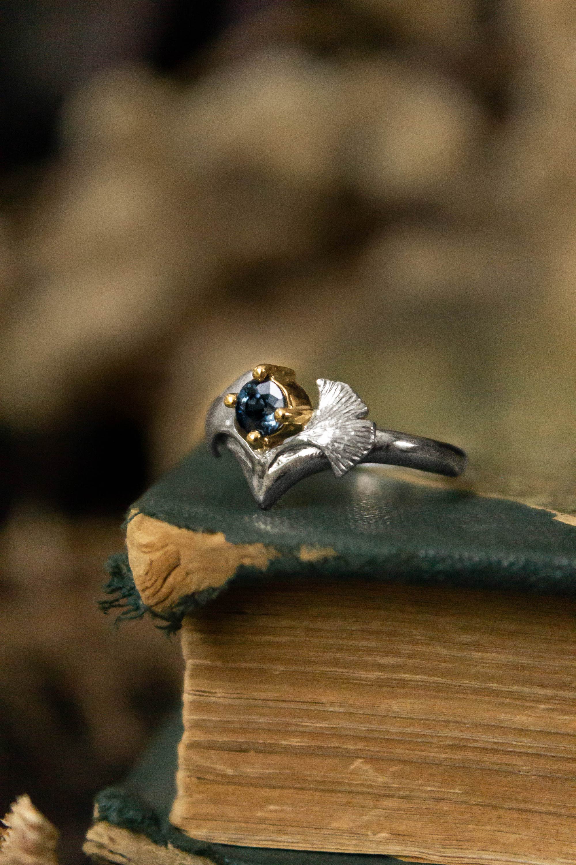Anillo inspirado en las hojitas del árbol de Ginkgo, con dos colores distintos de metal. Está hecho en platino con el cajón que sostiene la piedra en oro amarillo. Piedra central zafiro azul. Recuerda que este diseño lo podemos hacer personalizado con la piedra y metal que más te guste. Además, podemos hacer la argolla de matrimonio después calzando perfectamente con un anillo como este en forma de v.
