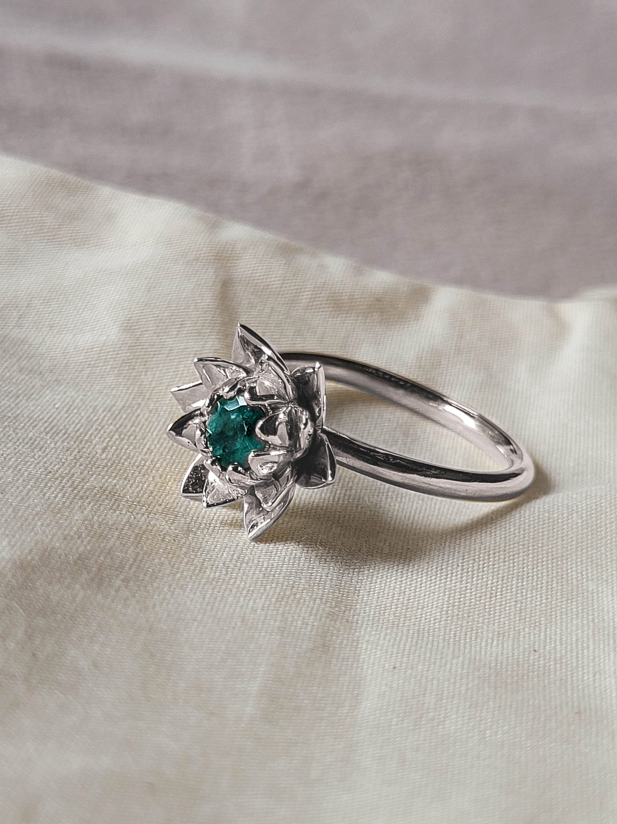 Anillo inspirado en la Flor de Loto, con dos capas de pétalos y engaste en grifa de una piedra central de 5 milímetros.
