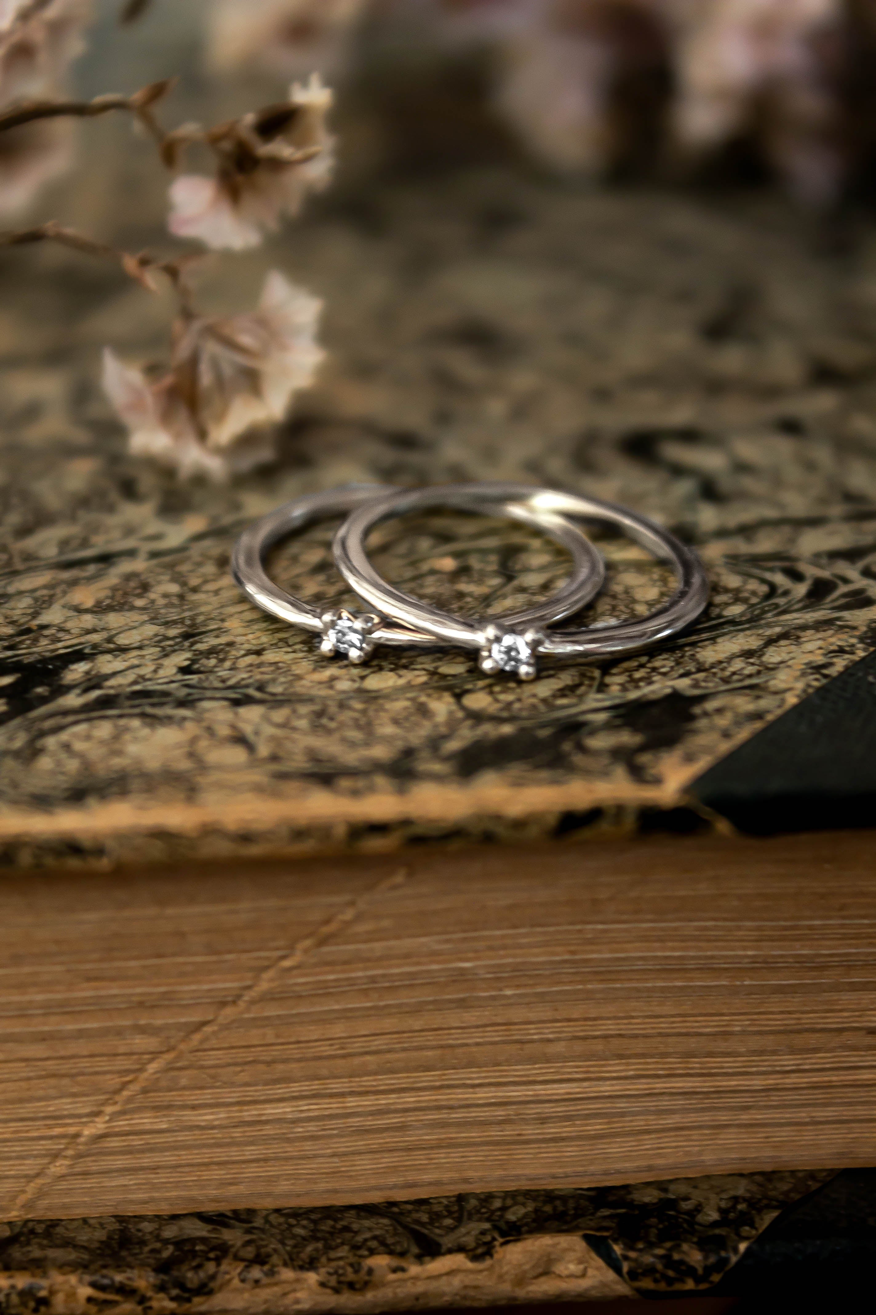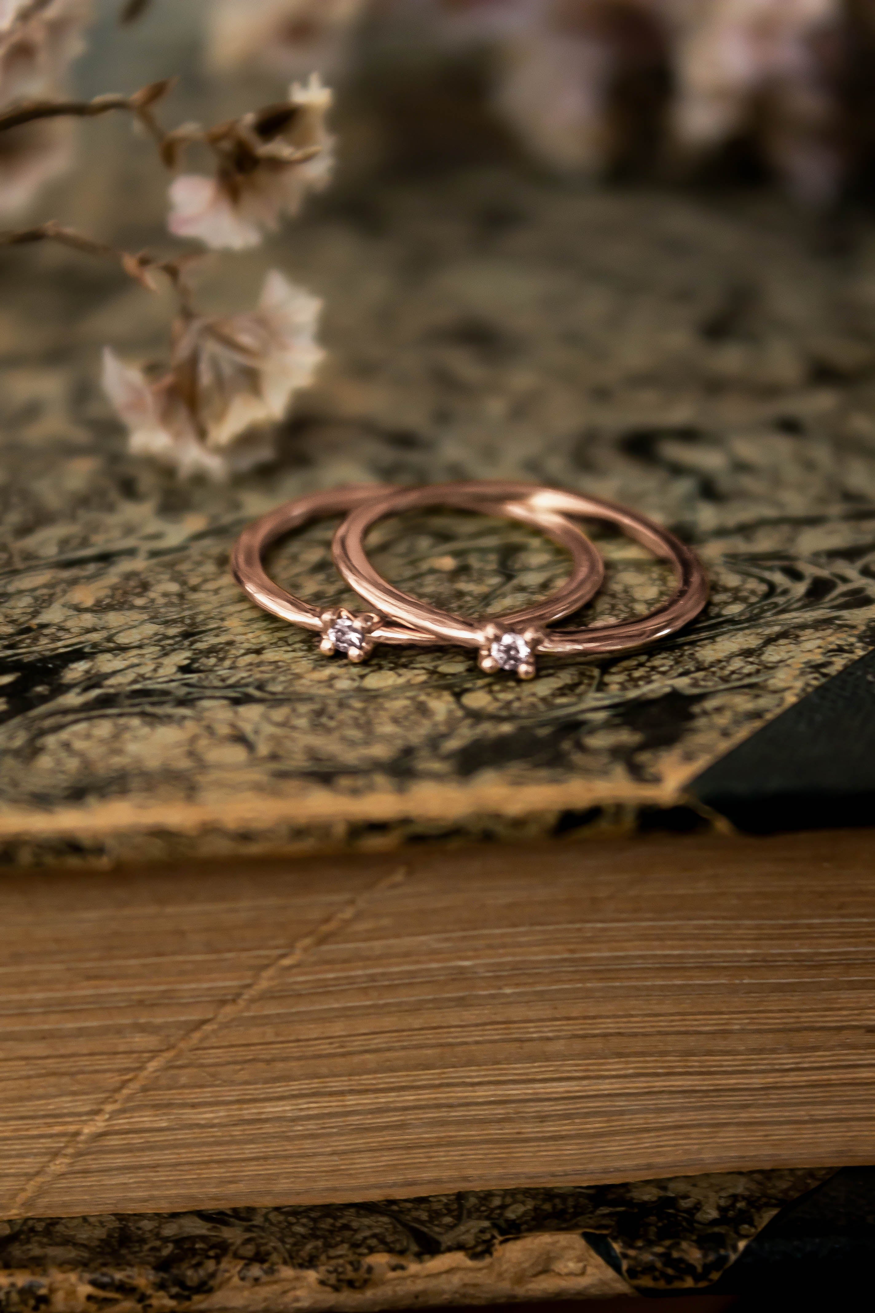Este es un ejemplo de anillos muy sencillos y delicados. Con una banda muy delgadita y redondeada y un pequeño diamante engastado en grifas.