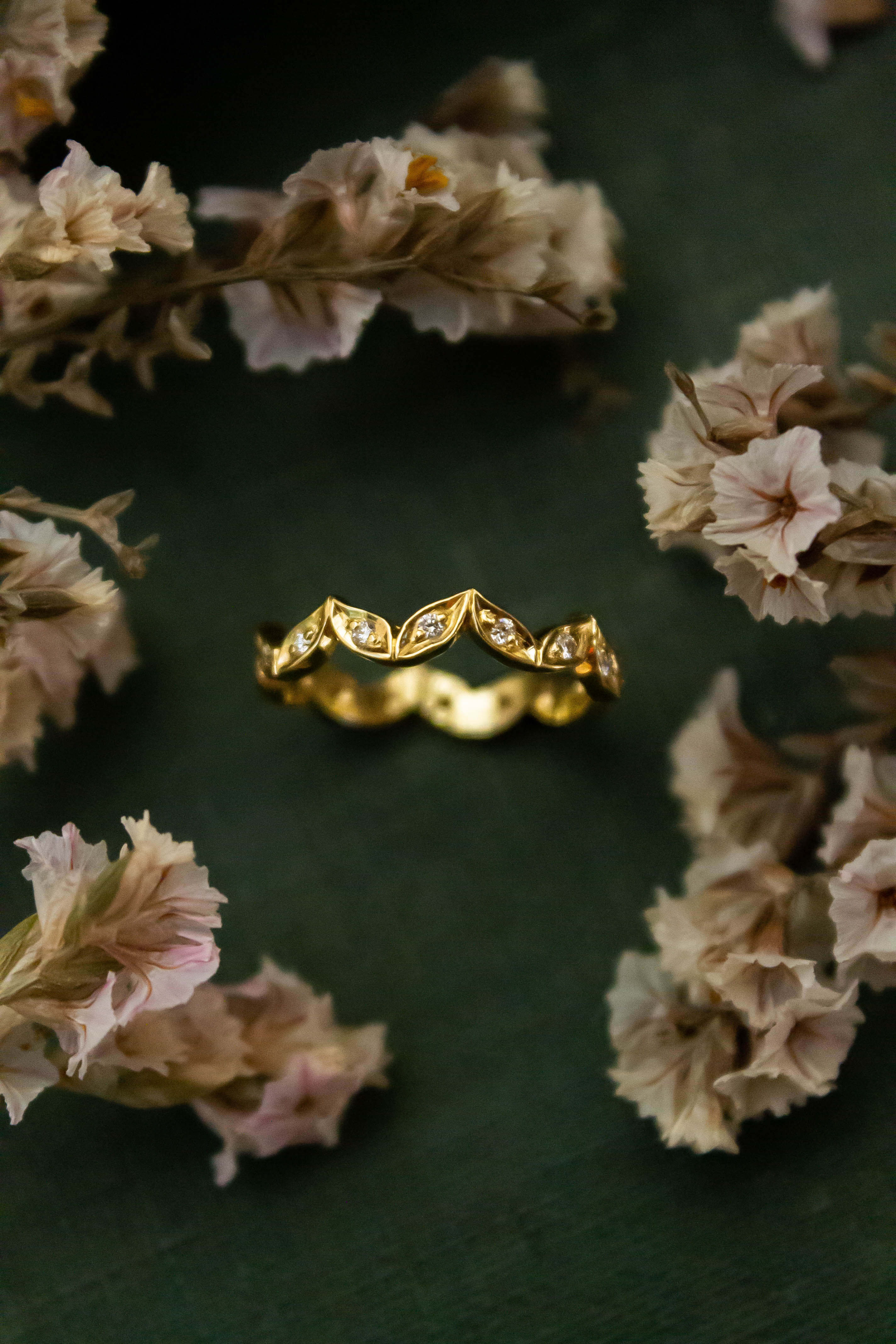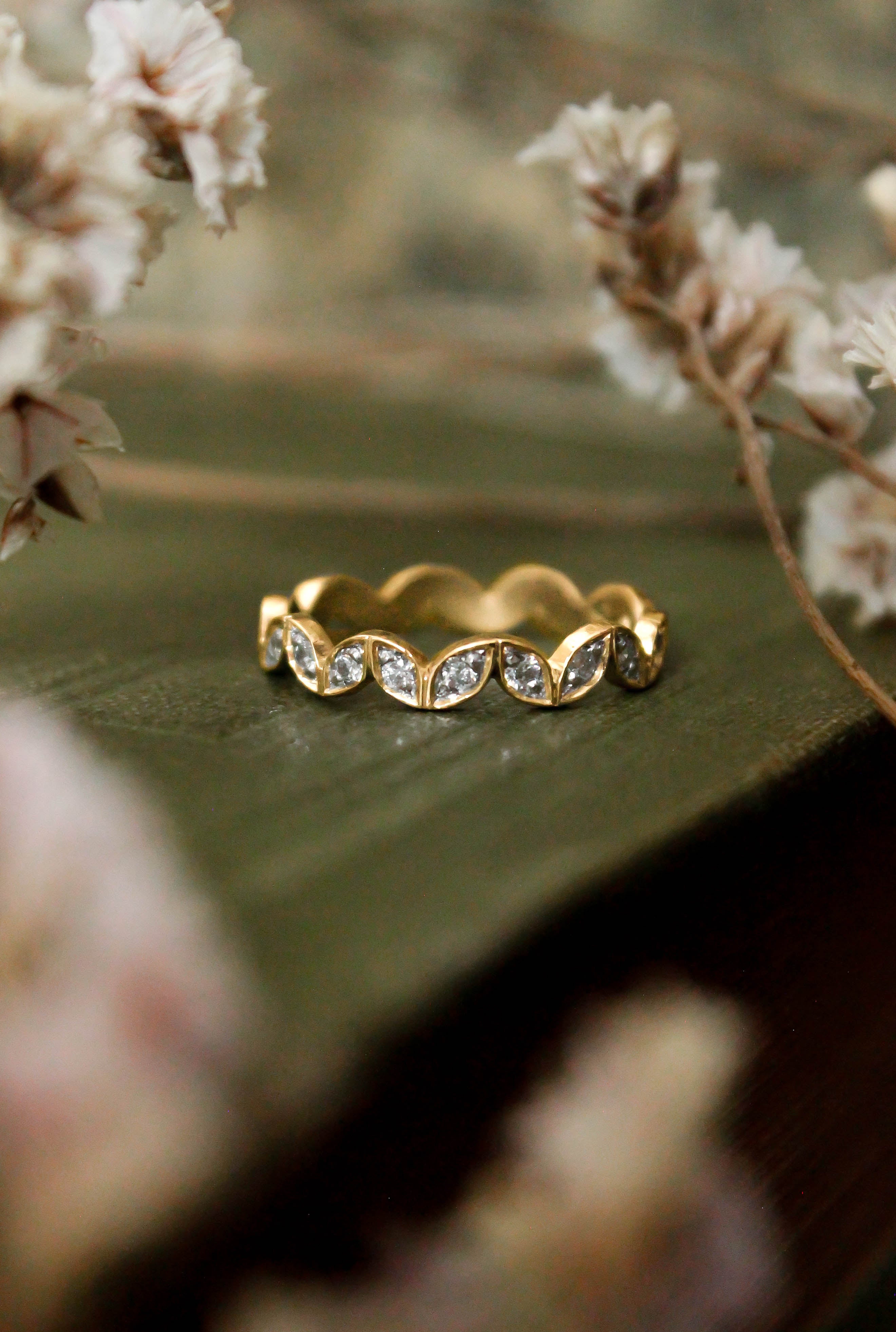 Anillo estilo Florentino, con hojitas caladas en punta y engastes en medio cintillo (mitad de anillo con piedras) o cintillo completo (circunferencia entera con piedras).