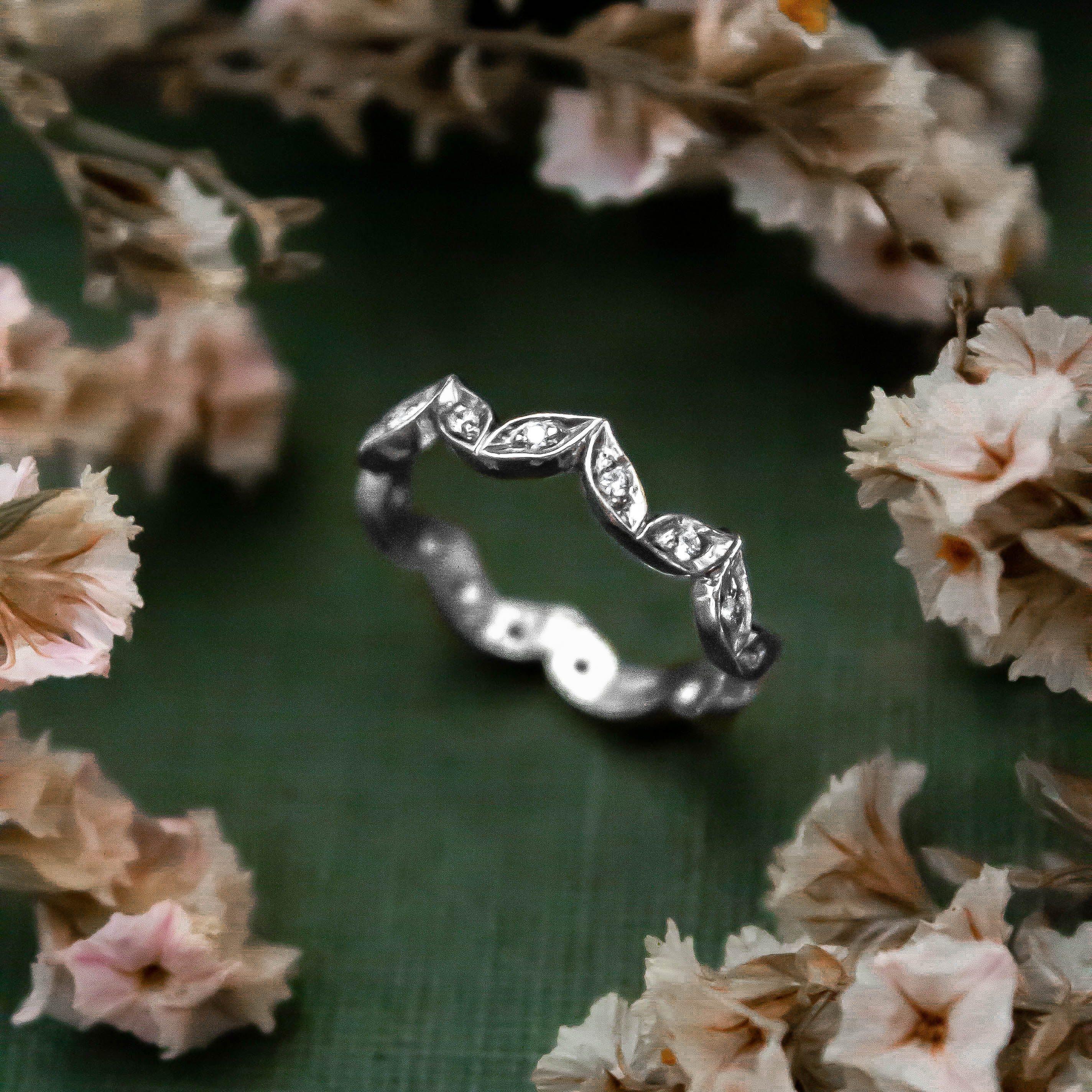 Anillo estilo Florentino, con hojitas redondeadas y engastes en medio cintillo (mitad de anillo con piedras) o cintillo completo (circunferencia entera con piedras). Hecho en platino y diamantes. ¡