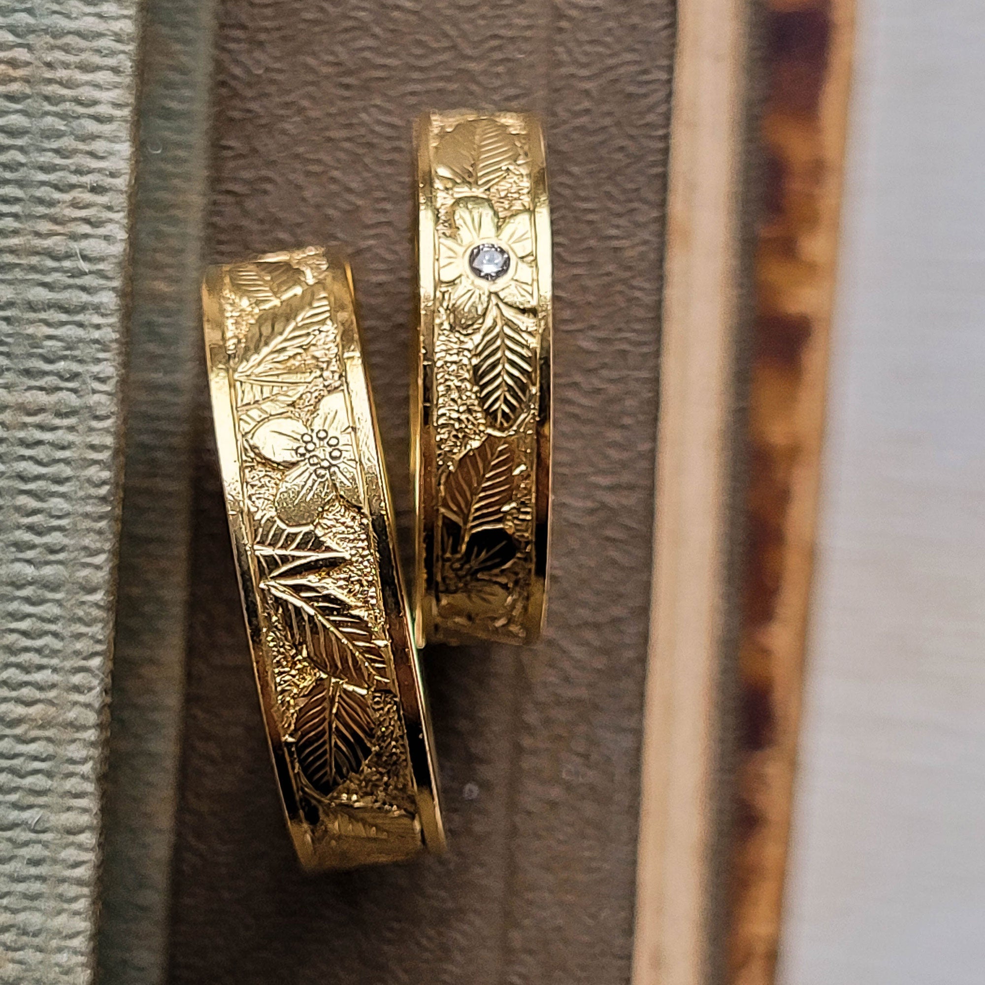 Argollas de matrimonio con motivos botánicos, hechas con la técnica de grabado de bajo relieve que produce dos planos en el dibujo, resaltando las hojas y dejando el fondo más bajo con su textura.