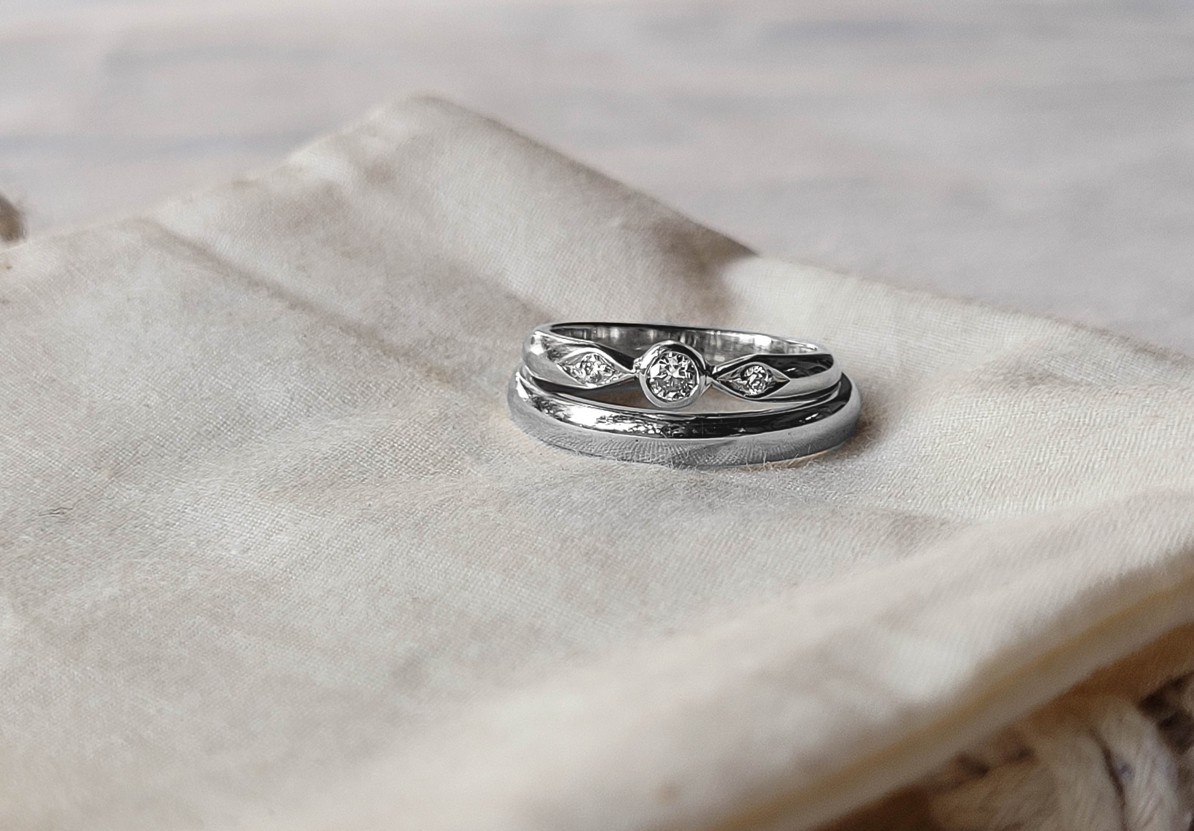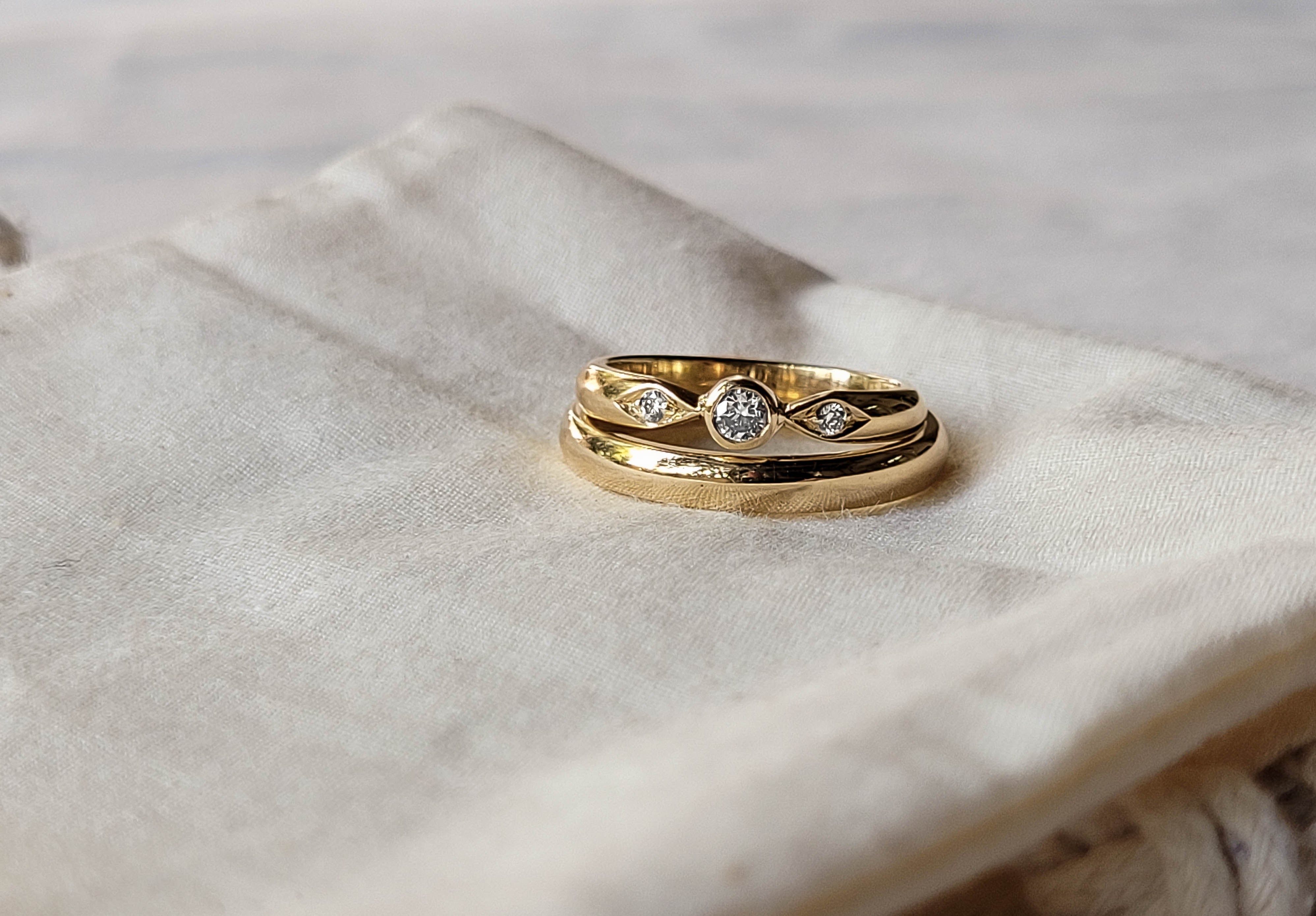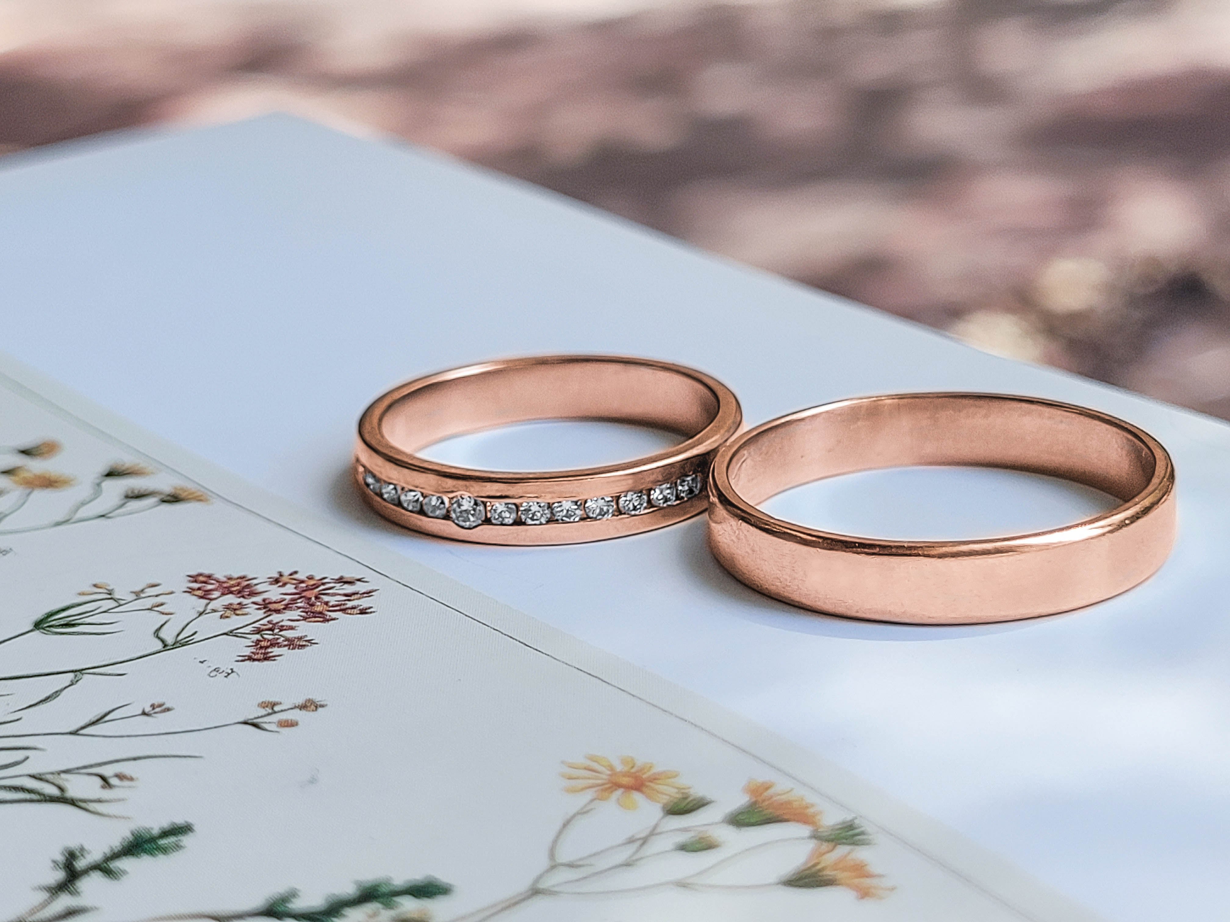 Partimos de unas argollas de forma recta con bordes redondeados y añadimos diamantes con engaste carril a la argolla femenina, con una piedra central ligeramente más grande que las laterales. De esta forma, puedes dar un toque especial y brillo a tus argollas de matrimonio.