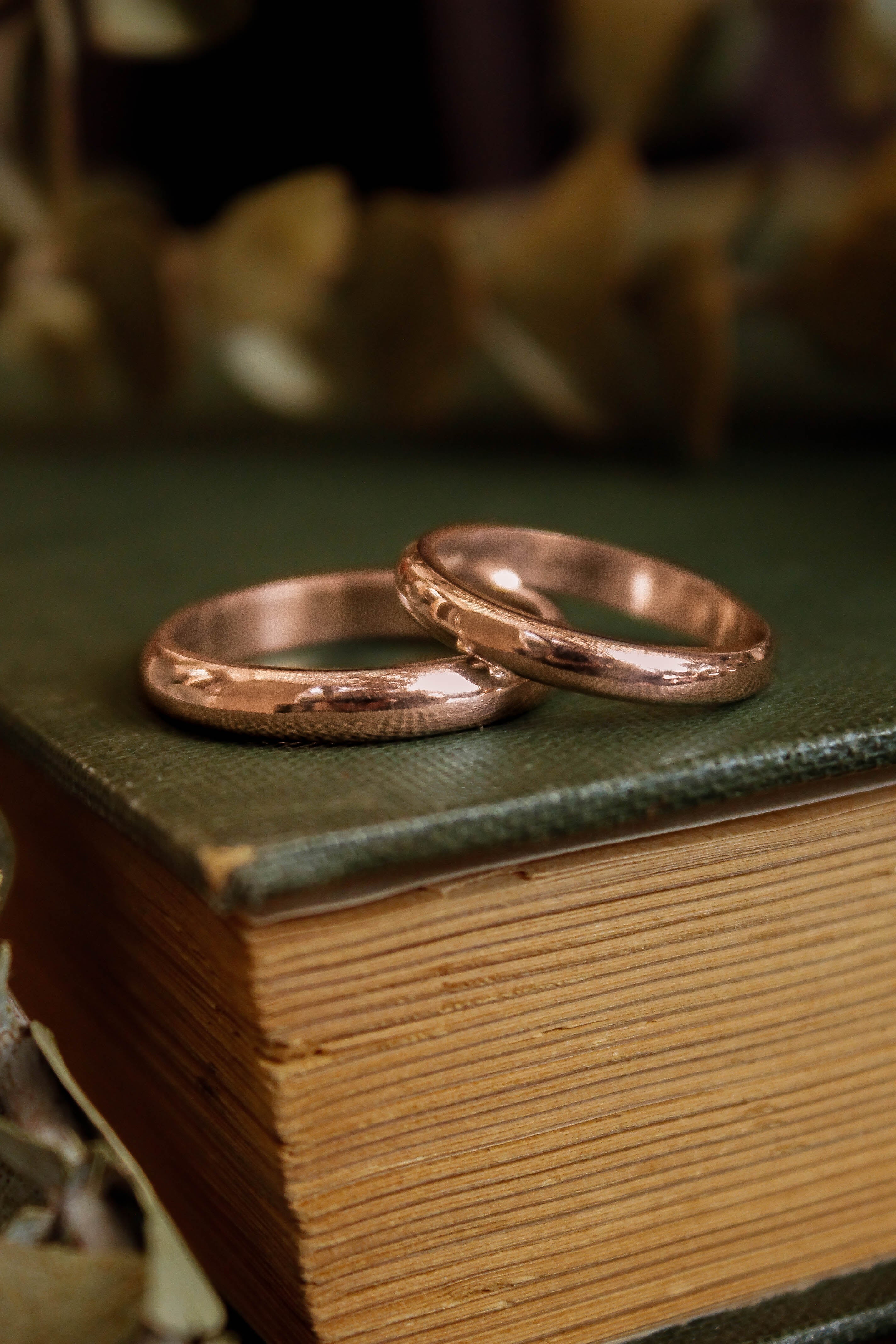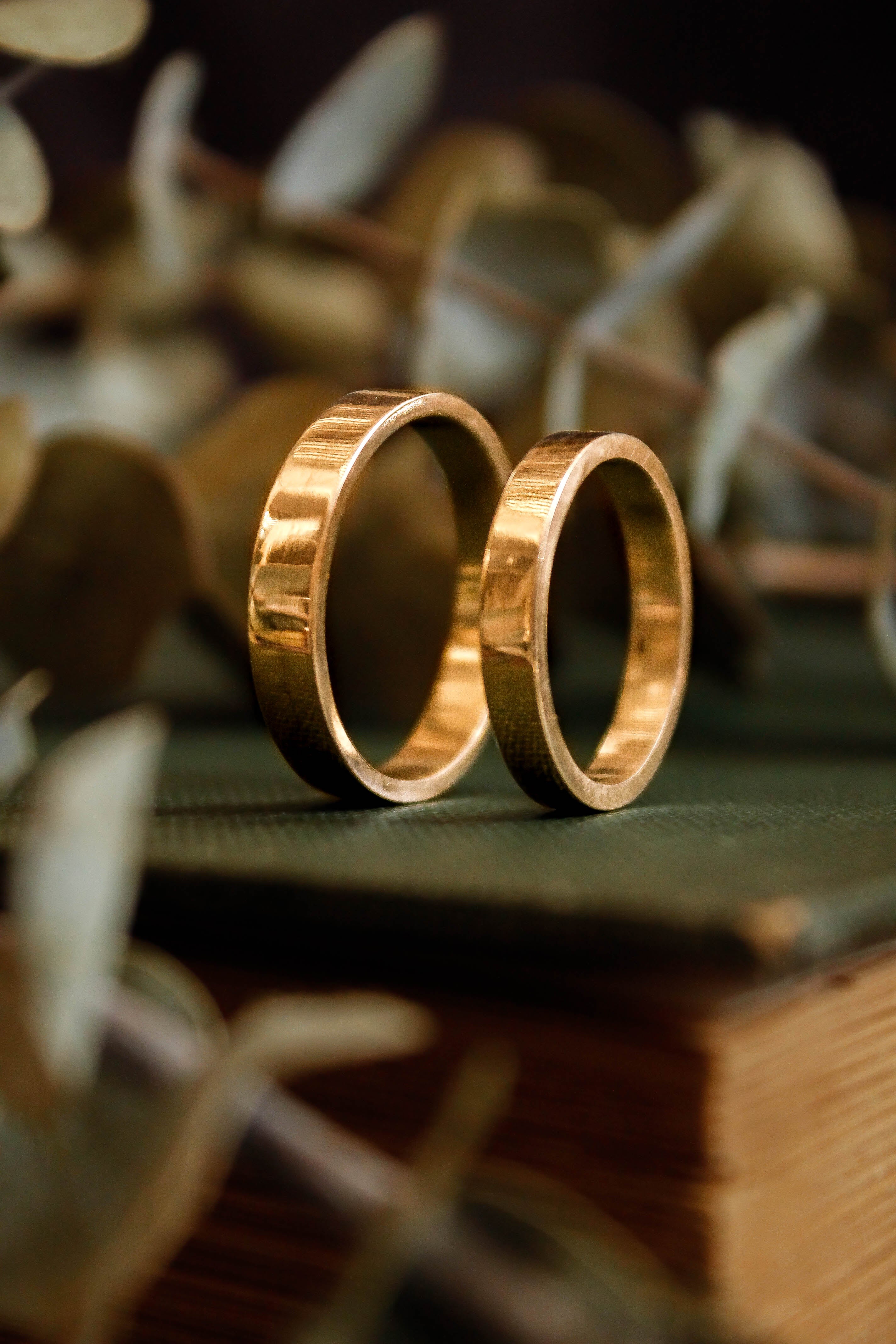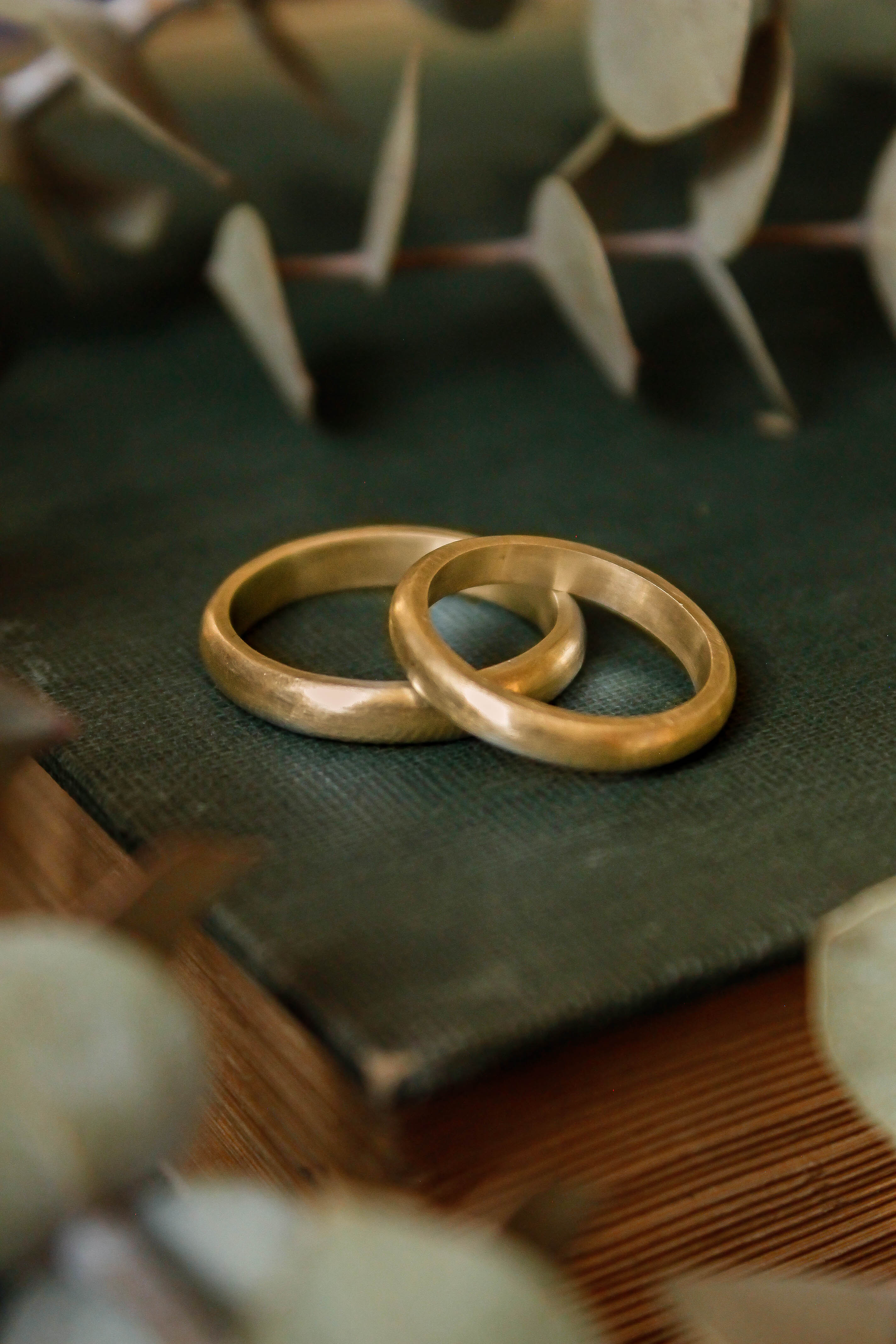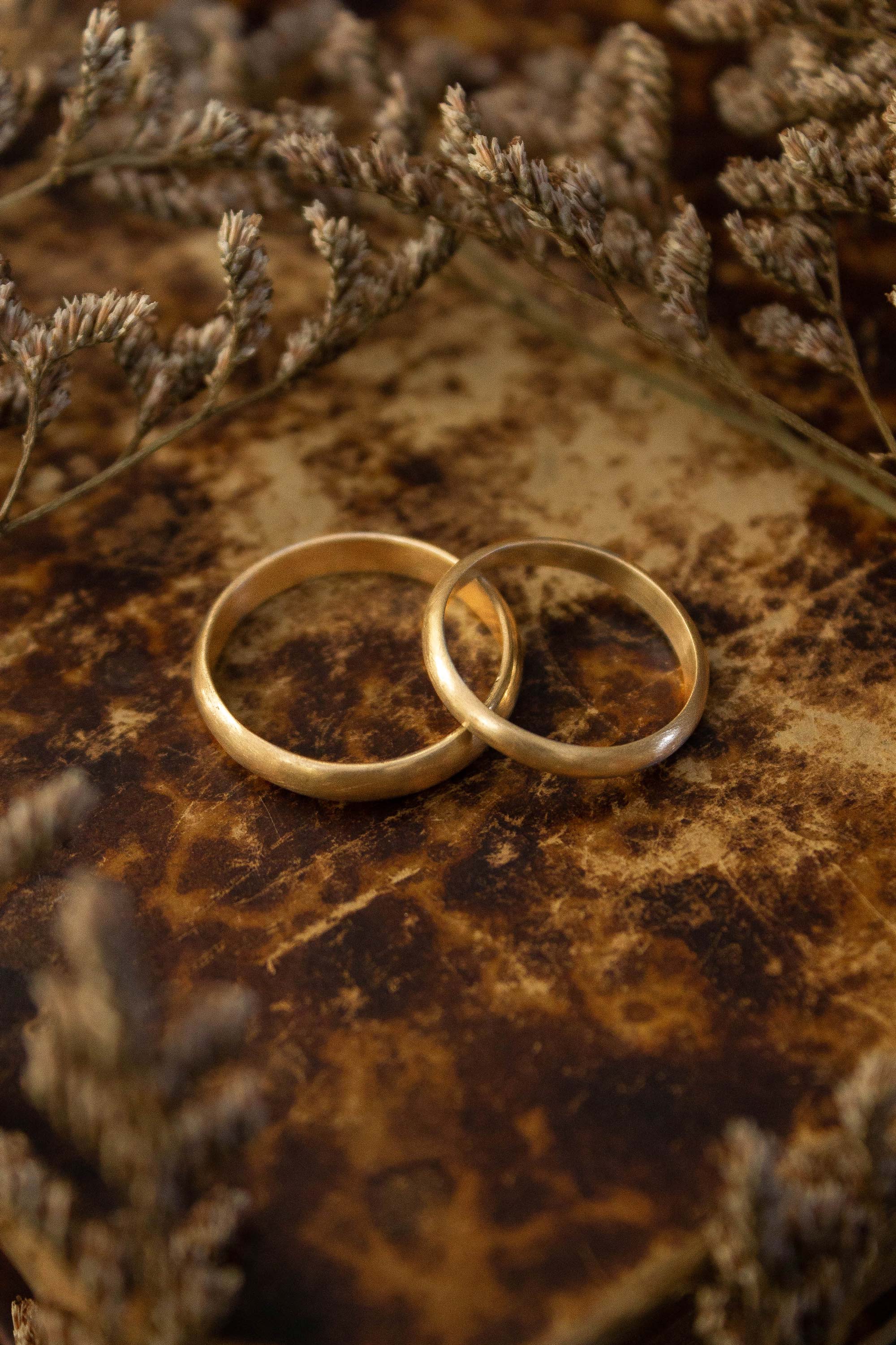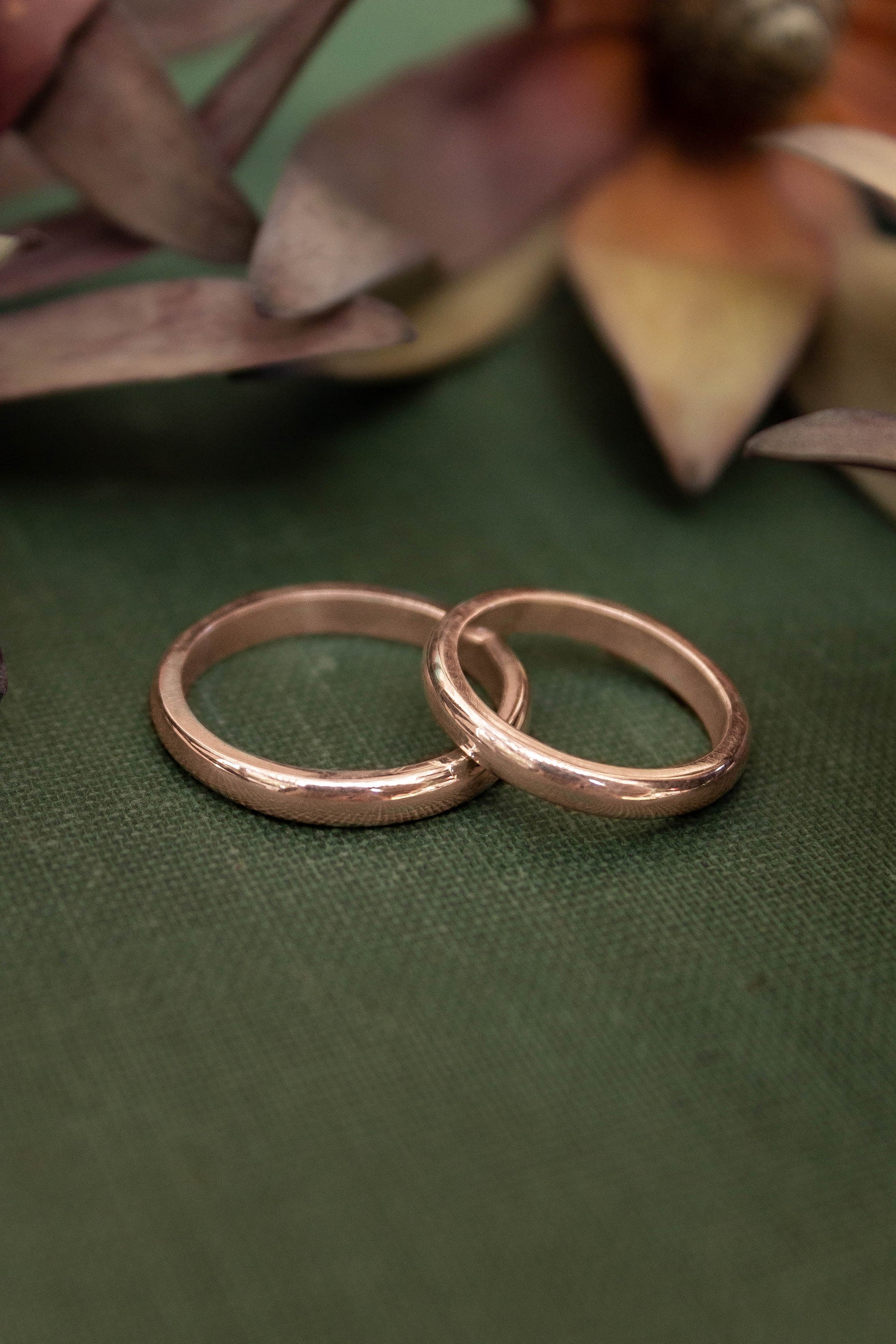 Argollas de matrimonio delgadas con acabos distintos, la argolla grande tiene forma de “media caña” quiere decir que es circular y un acabado brillante, mientras que la argolla pequeña tiene una forma lisa pero un acabado satinado.
