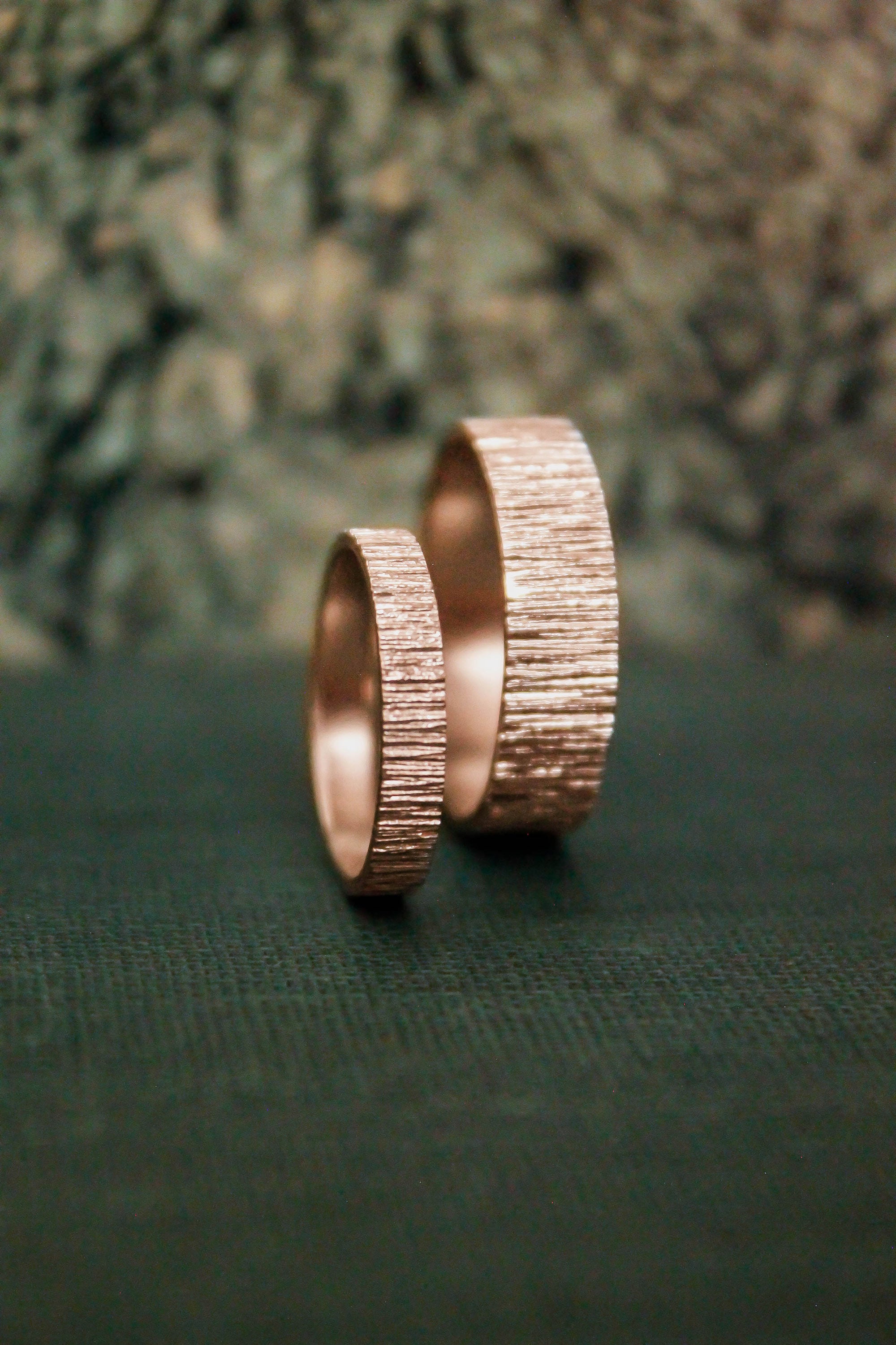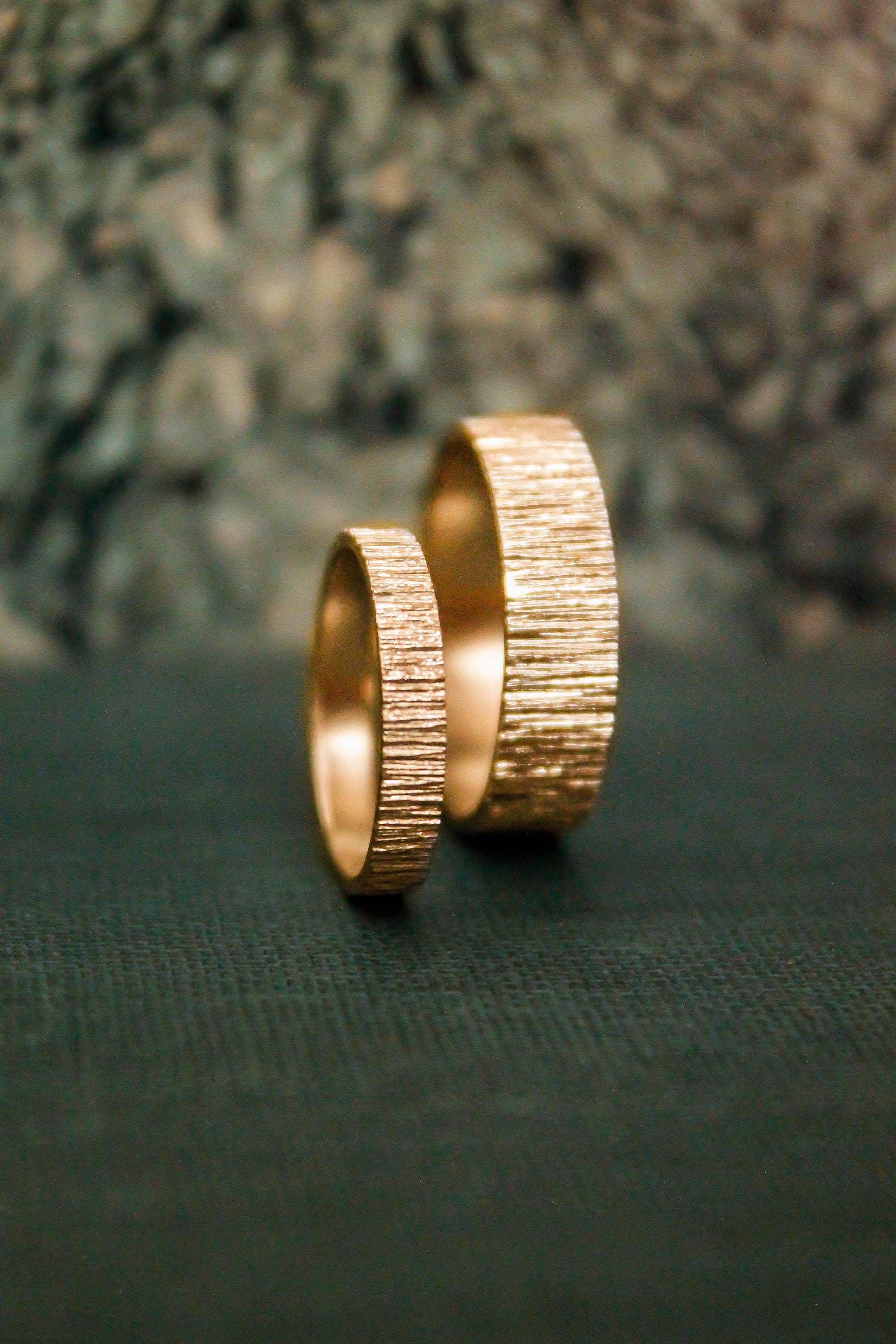 Argollas texturadas con ranuras que asimilan un tronco de árbol.